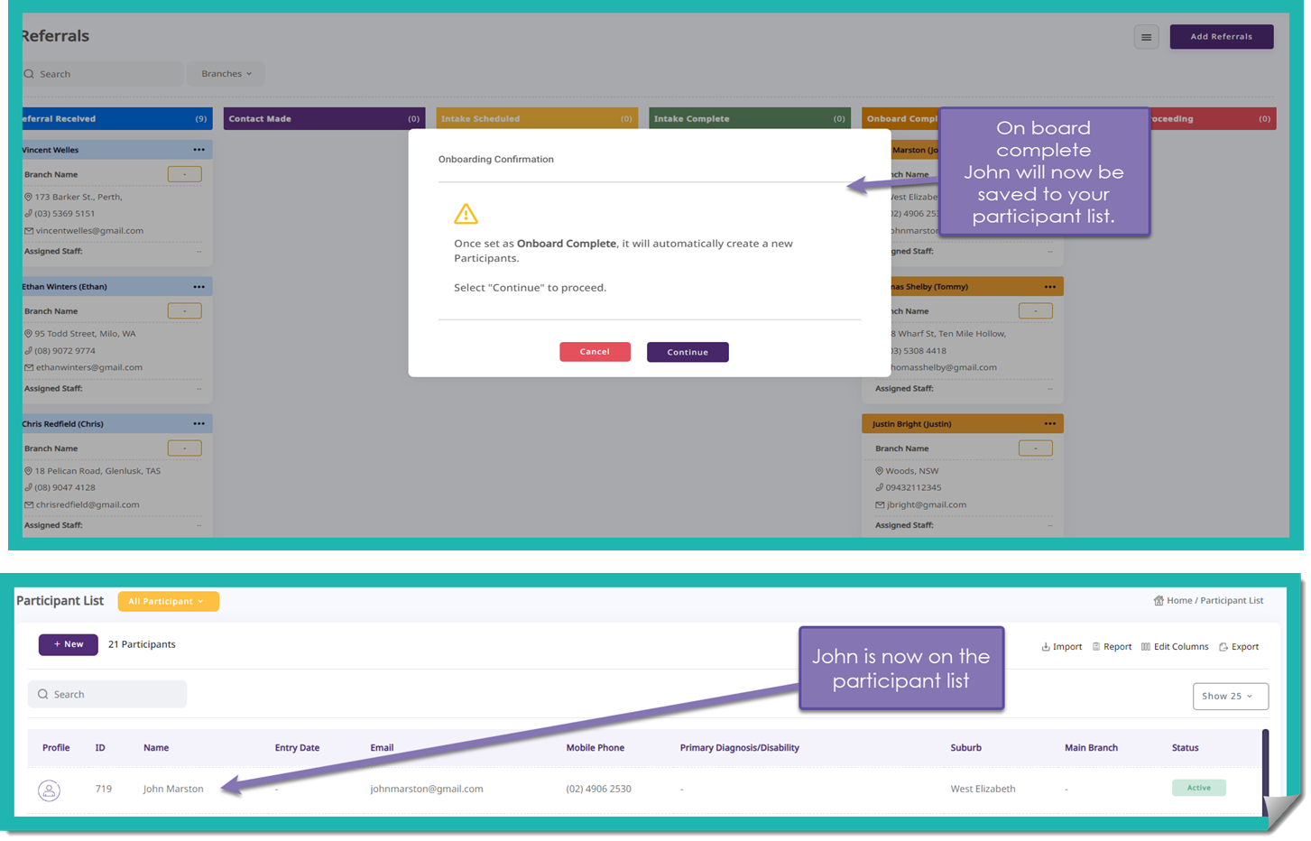You can now advance your customers as they move through the process until they reach the Onboarding Complete column. Once your customer has reached this stage, a dialogue box asking you to proceed will appear. Confirming this action will place that customer in your participant list, where you can add further details, find support, and action shifts.