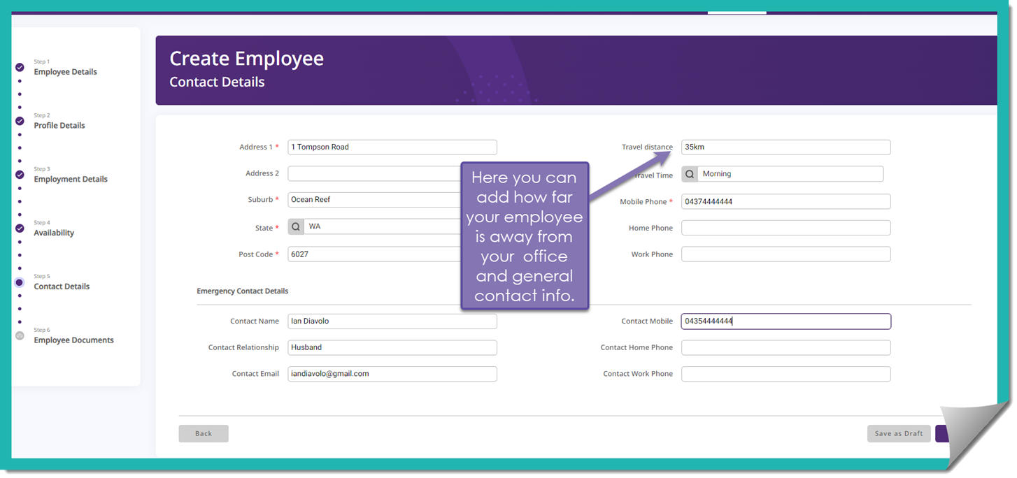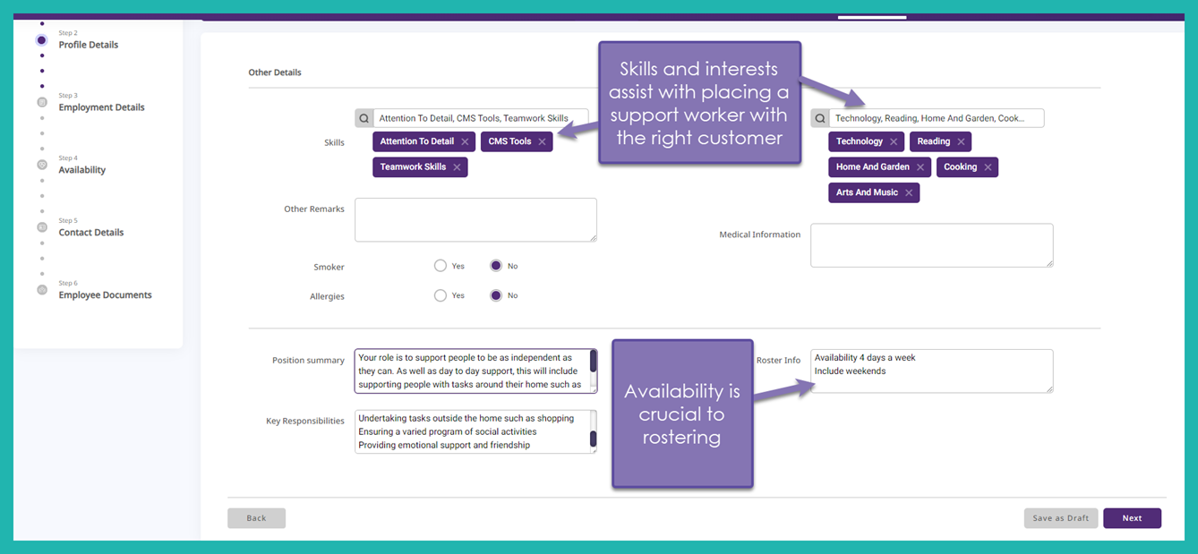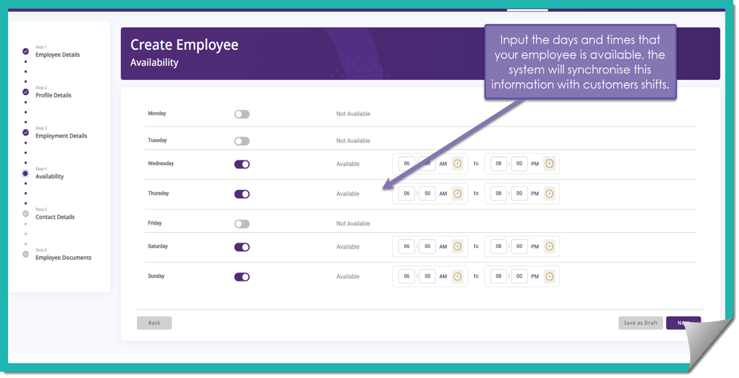 Here you can nominate what hours and days your employee is available to work, making it easier to match up shifts to your customers.