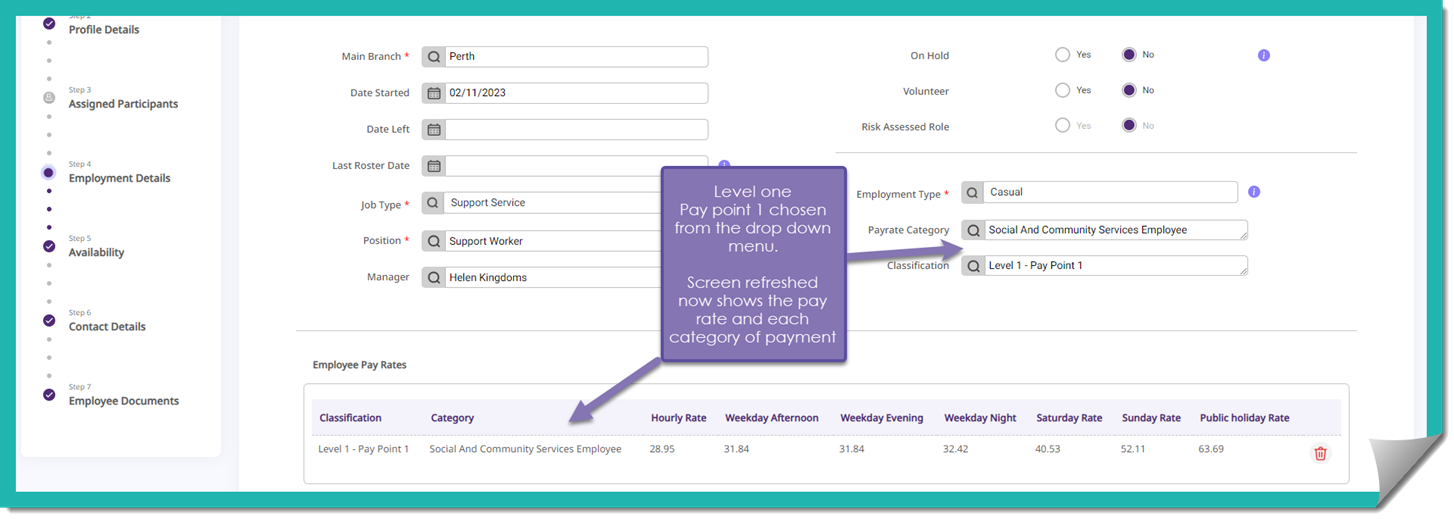 Now you will need to go back to the employment details section (step 4) of the employee and add their payrate. You will note that the employment type appoints the payrate category. The SCHADS award is preloaded into Lama Care, and you decide the classification.