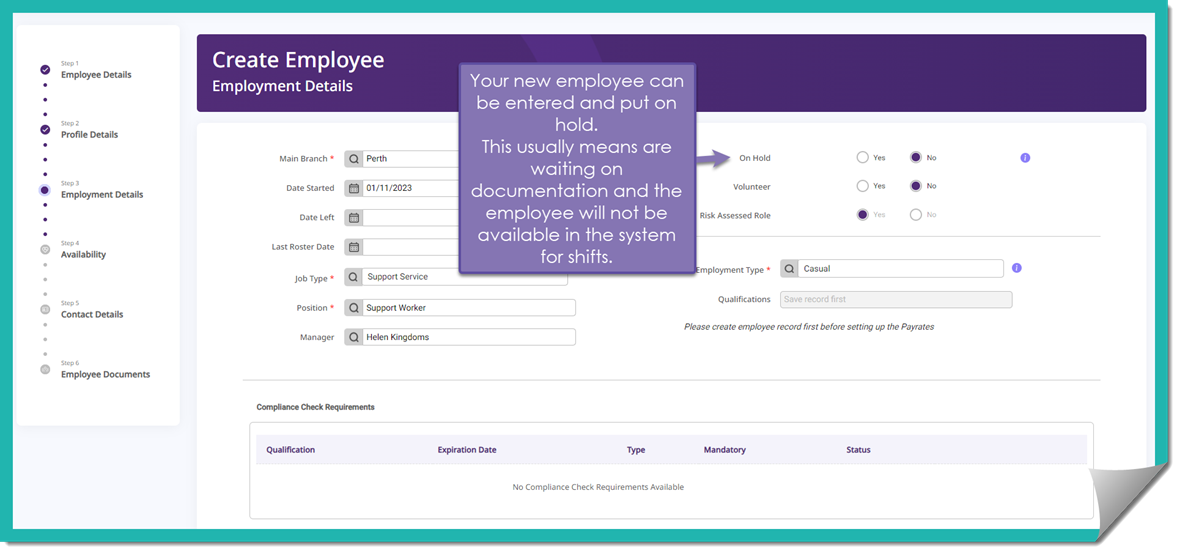 - On Hold – Dependent on whether all paperwork has been sighted, you can place the employee on hold until all paperwork has been received.
