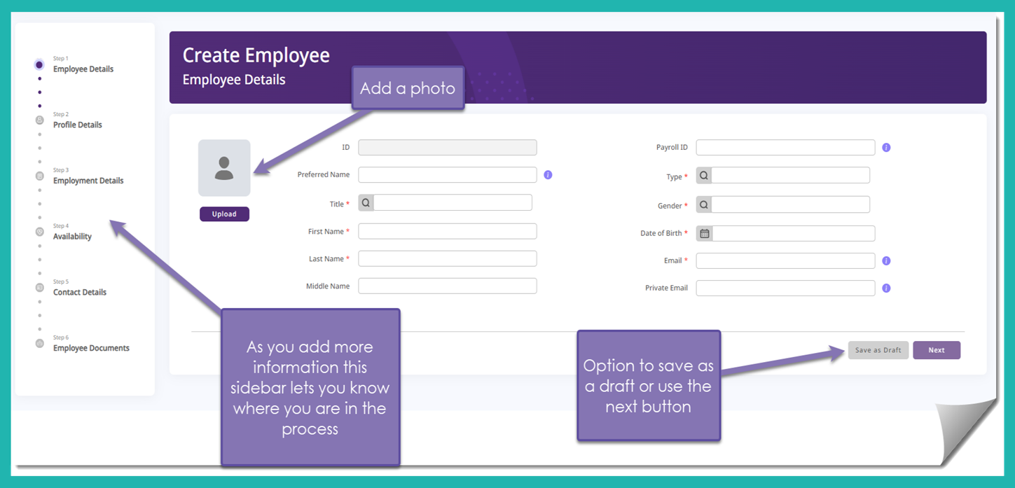 - Gender – There are options for your staff who identify as non-binary or other.